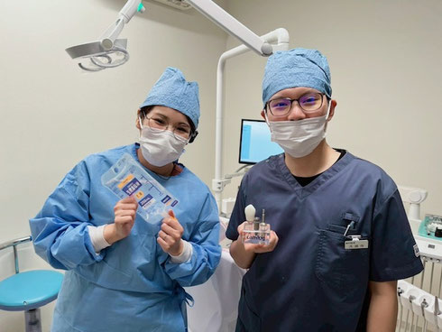 今日の写真は、インプラントオペを無事に終え、患者さんをお見送りした後に撮影した歯科医師と歯科衛生士の一枚です。